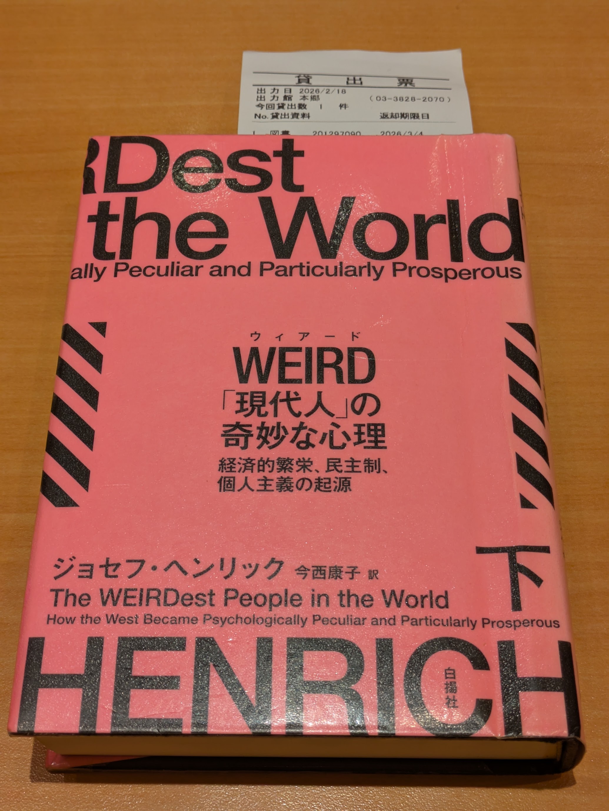 上巻の時に書き忘れたが、WEIRDはWestern, Educated, Industrialized, Rich, and Democraticの略。西洋というよりはキリスト教社会と捉えたほうが良く、それが教育の促進、工業化の促進、経済的伸長と民主化を進めたという主張である。