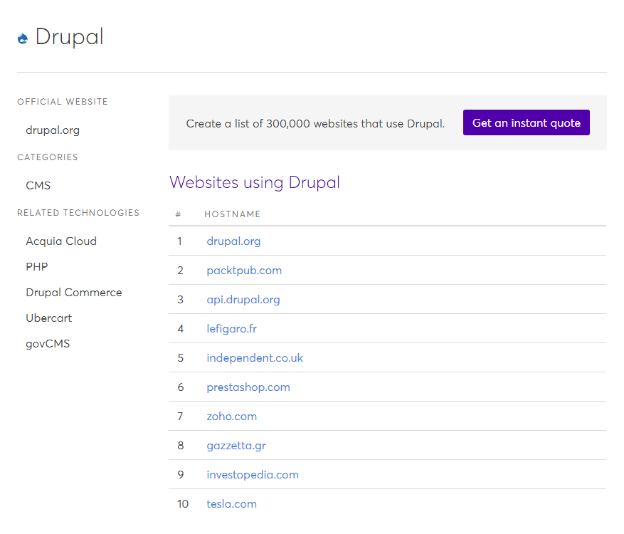 予想通り、CMSの雄WordPressが圧倒的シェアで77%、Drupalは3位である。ただ、Webサイトの数が多いからと言ってWordPress一択で良いと考えるのは短絡的である。次いで、Drupalを利用しているサイトも当たって見る。