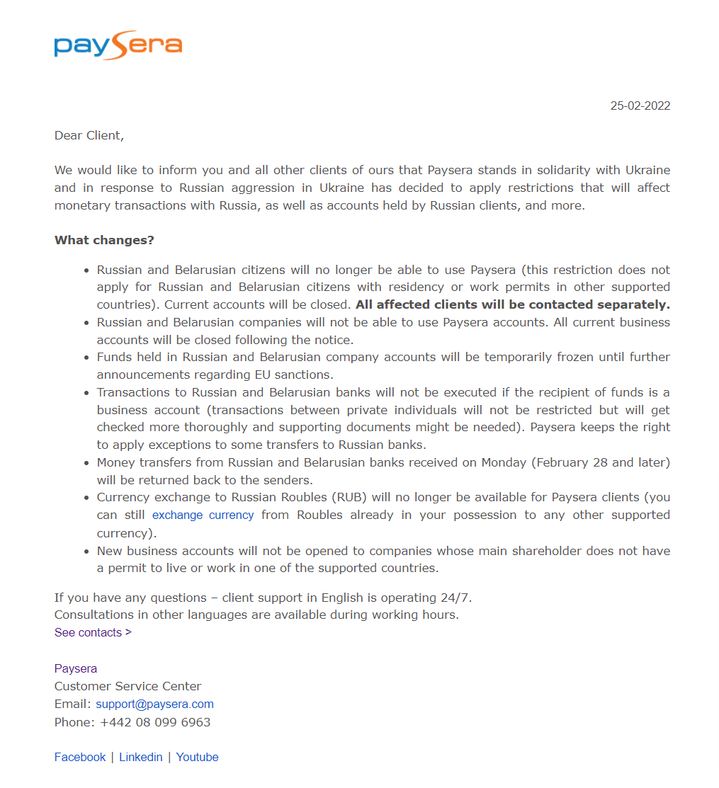 Payseraからロシア、ベラルーシとの取引停止のアナウンスがあった。 ロシアとベラルーシの市民、企業は凍結とある。日本のニュースで聞いていると何か遠くの話に感じられるのだが、欧州の口座をもっていると半端ない臨場感がある。 ベラルーシには2年ちょっと前に行ったばかりで、ホテルでエレベータに閉じ込められたのを記憶している。 専制と隷従を脱し、平和と自由を手にすることを望む。 タグ ライフスタイル 政治
