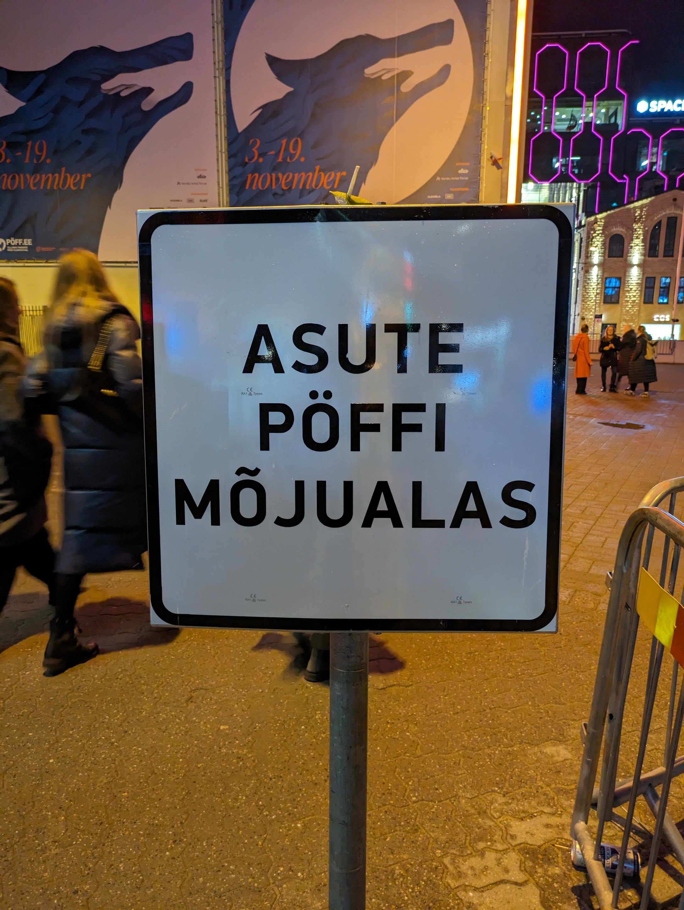 ※画像は、会期中いろいろなところに立っていた看板。後ろの狼の展示が11月3日〜19日というPÖFF(タリン・ブラックナイト映画祭)会期を示している。19日(日)は最終日だったということだ。11月8日に何だろうと思って撮影した写真で、たまたま街で聞いてみても観光客だったのか何のことだかわからないという返事が帰ってきた。思い起こすとコロナ下の2011年、日本から映画祭に出展していた人の集団にモールで遭遇していた。その時は、急遽の帰国準備でPCR検査が話題になっていた。2年は短いようで長い。